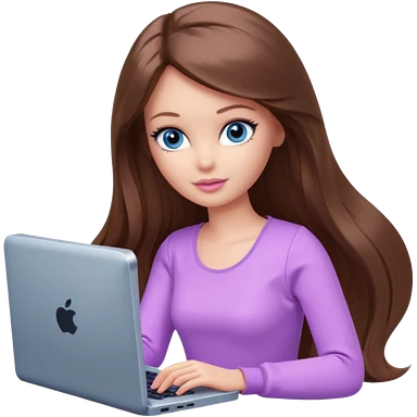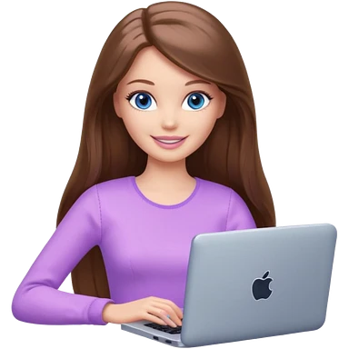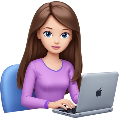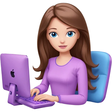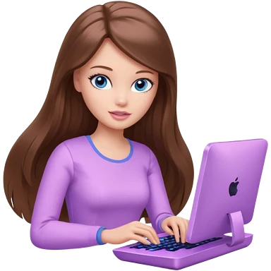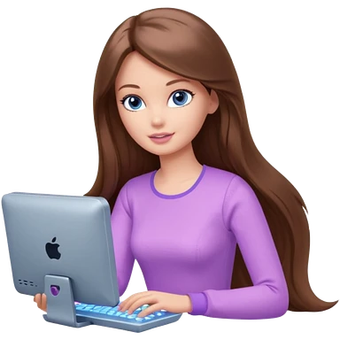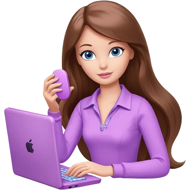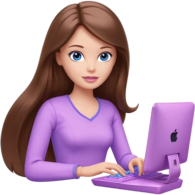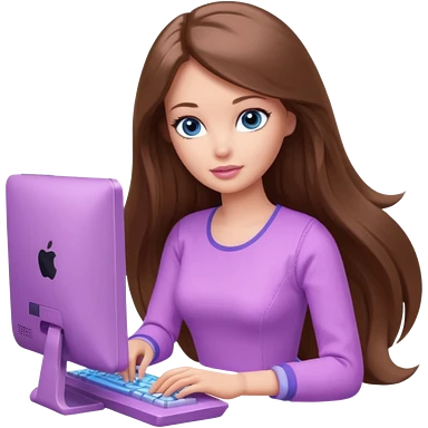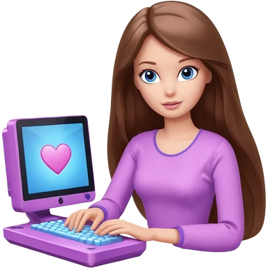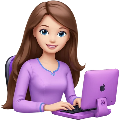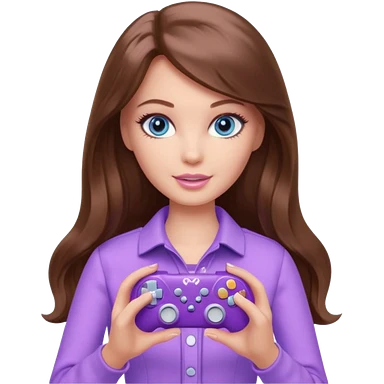 beautiful barbie girl with long brown hair, blue eyes and wearing light purple clothes playing computer games emoji