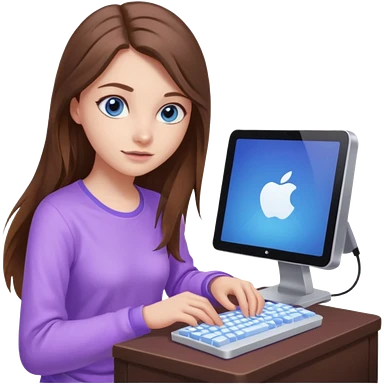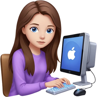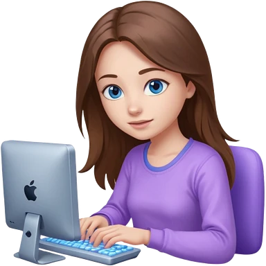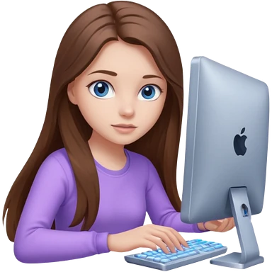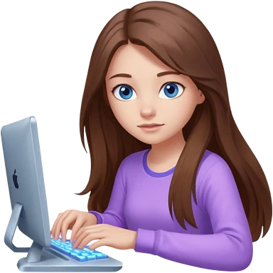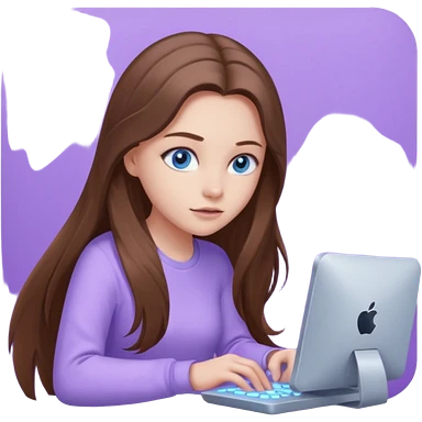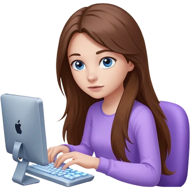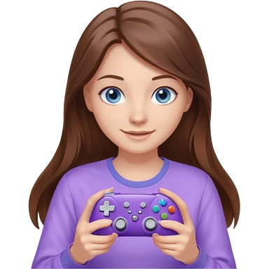 beautiful girl with long brown hair, blue eyes and wearing light purple clothes playing computer games emoji