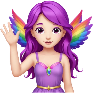 Female fairy Long purple hair Pink dress Rainbow wings Waving one hand Saying hello emoji