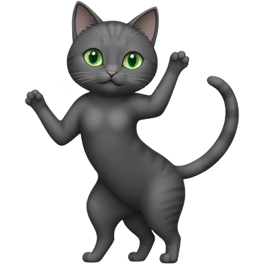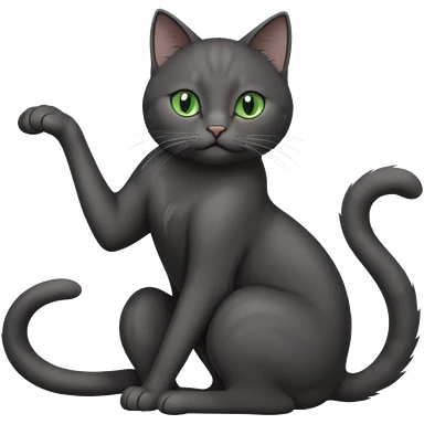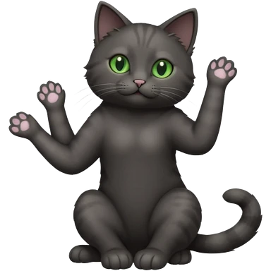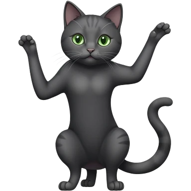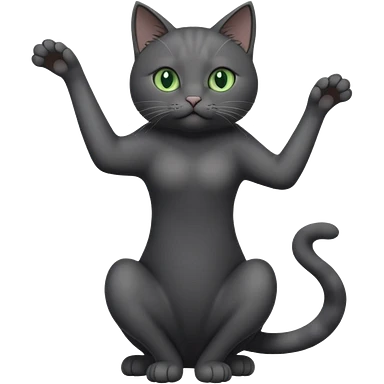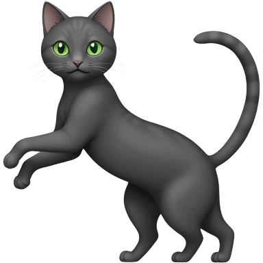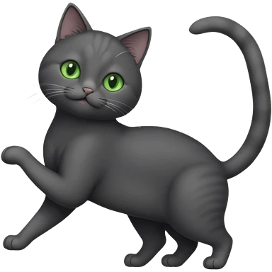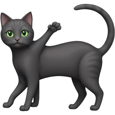 full body gorgeous solid dark grey cat with green eyes, white paws and white whiskers stretching like a cat emoji