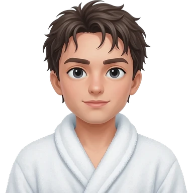 A girl with fair skin, long black hair, just got out of the shower, wrapped in a blanket and holding a black cat emoji