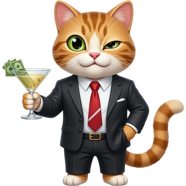 Give me a cat with a devious smirk and side-eye, with money and and dirty martini in hand emoji