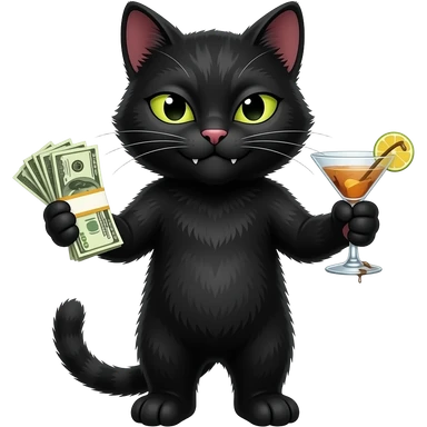 Give me a black cat with a devious smirk and side-eye, with money and and dirty martini in hand emoji