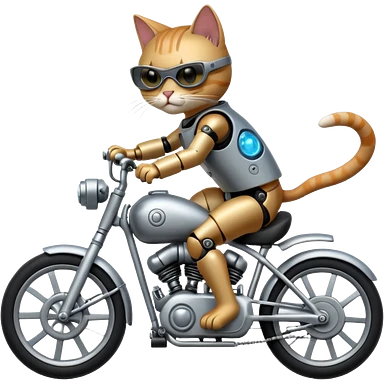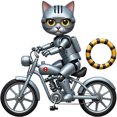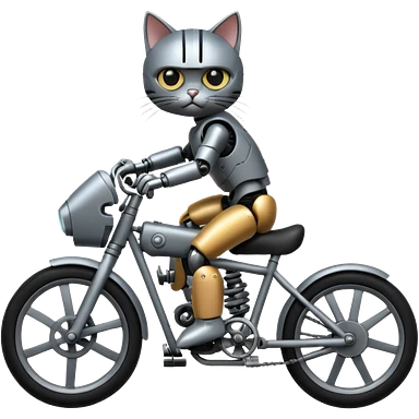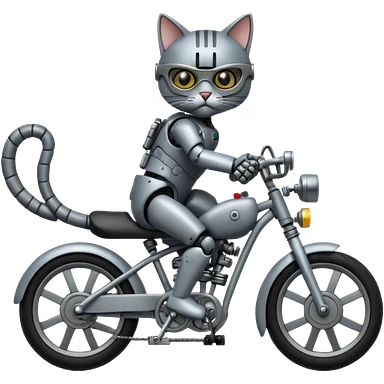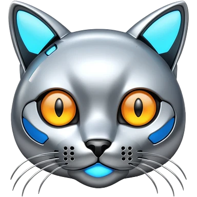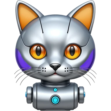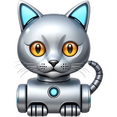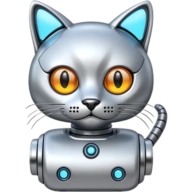 Create a stylized emoji (pixel style, flat design) of a cat with elements of the cyborg Terminator. The cat should be recognizable as an emoji (simplified shapes, large details), but with a metal skeleton, a glowing red eye (like the T-800) and mechanical details on the face and paws. The second eye could be a regular cat eye. Add some smoke or damage to emphasize the combat style. The background is transparent or neutral. The style is a mix of cute and technological, emphasizing the contrast between the soft cat form and the hard metal. emoji