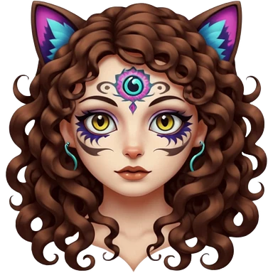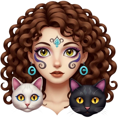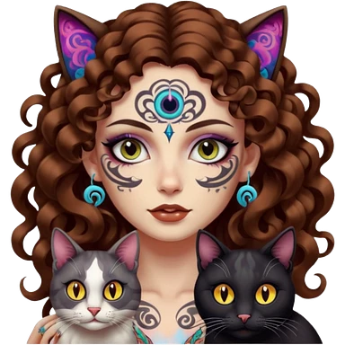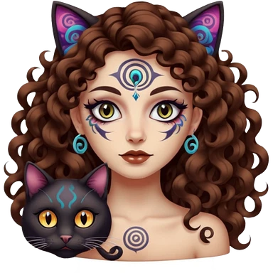 woman with long curly brown hair, brown eyes, white skin, tattoos, black cat with psychedelic spiral eyes mirroring hers emoji