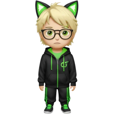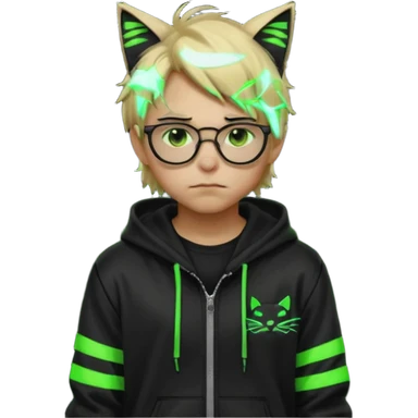 Light blond, slightly messy hair Black glasses A black hoodie with cat ears Neon green details on the jacket and pants (glowing lines and stripes) An overall hacker / cyberpunk style look A neutral facial expression (boy )eyes brown) the hood with ears emoji