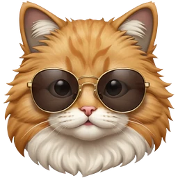 A cool, cartoon-style face cat wearing oversized black sunglasses, sitting confidently with a relaxed expression. The cat has smooth fur, a small smirk, and a playful yet stylish posture. Flat, modern illustration, minimal shading, digital art, white background, iOS emoji aesthetic. emoji