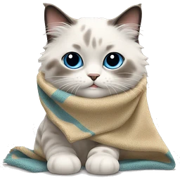 Black tiger cat with white mouth, white neck, with a cozy blanket emoji