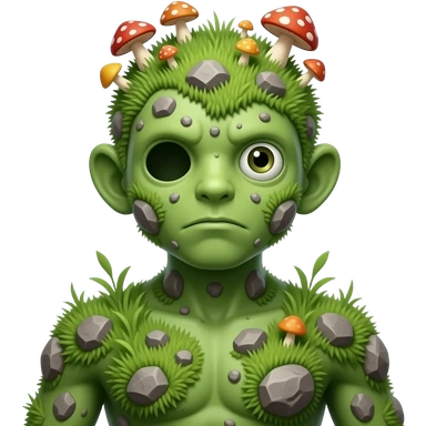 A humanoid thing with grass on it with rocks on it different mushroom growing on its head with no ears no mouth one single eye full body emoji