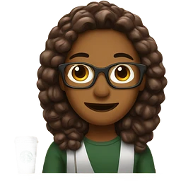 Beautiful and fashionable half white half asian starbucks barista with green apron, long dark brown hair and cat eye makeup and light glossy lips and blush emoji