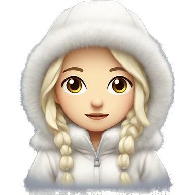 girl with fluffy white coat and white hat on head, bit stressd like droplet in anime, because it's cold emoji
