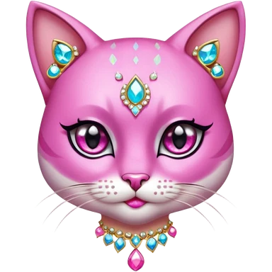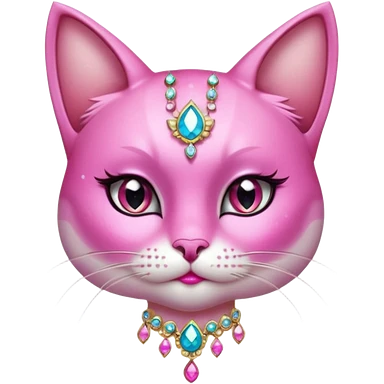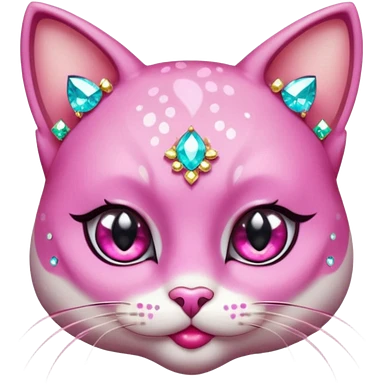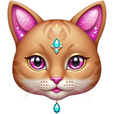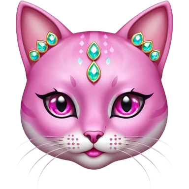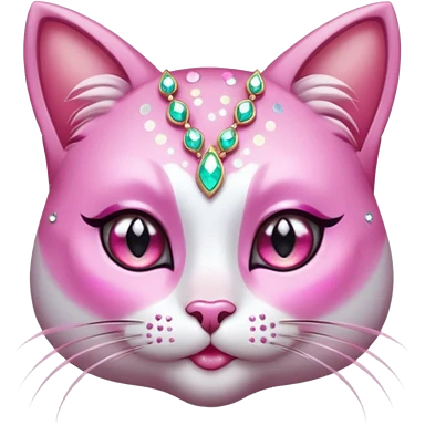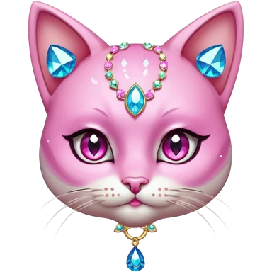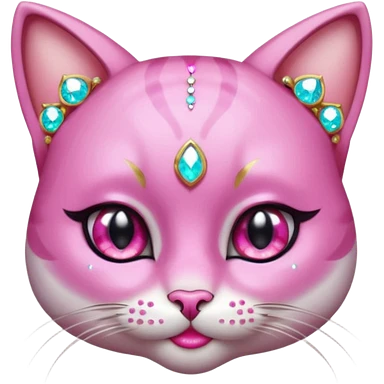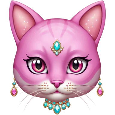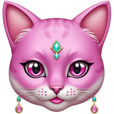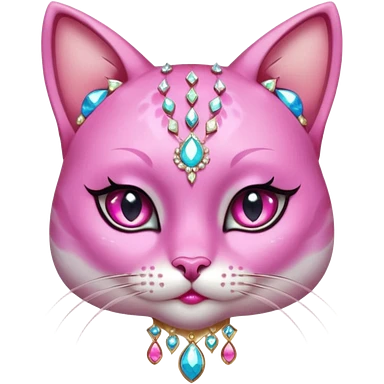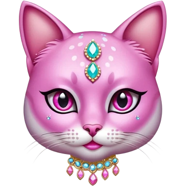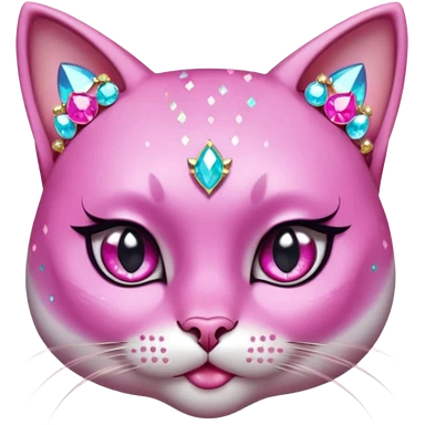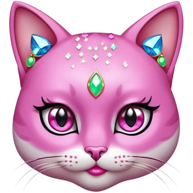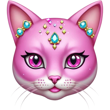 glamorous cat portrait, head and shoulders only, exaggerated pink makeup, bright eyeshadow, long eyelashes, shiny blush cheeks, sparkling face gems, glitter accents, elegant earrings, fantasy beauty style, cute 3D cartoon, mobile game icon style, clean background, no text, no watermark emoji