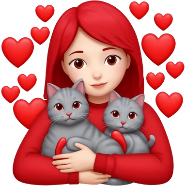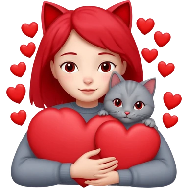 Ginger haired girl with blue eyes hugging a solid grey cat with yellow eyes emoji