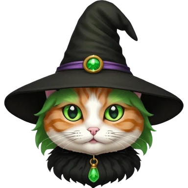 brown calico cat with brown face and green eyes with witch hat on emoji