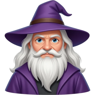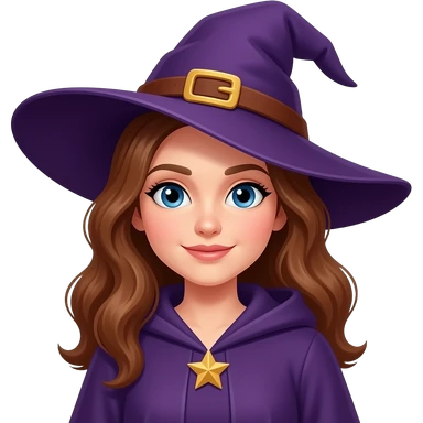 Wizard blue and purple and Grey robe and wizard hat point to one side with brim around holding a staff smiling brown eyes with a calico cat perched on shoulder emoji