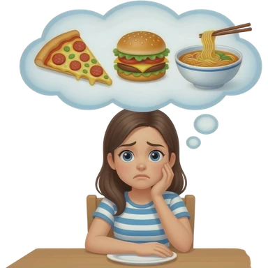 A worried young woman sitting at a table, anxious expression, a large thought bubble over her head. Inside the thought bubble, there is a delicious variety of food like pizza, burgers, and ramen. Illustration style, clean lines, vibrant colors. emoji