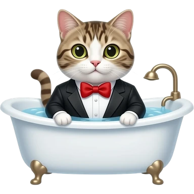 Cat shower in bathtub. A tuxado cat with red bow emoji