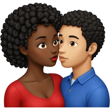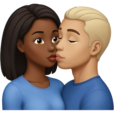 A dark skin woman with a light skin man who has black short curly hair kissing emoji