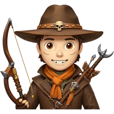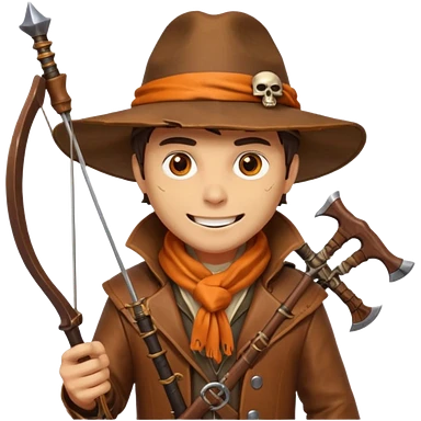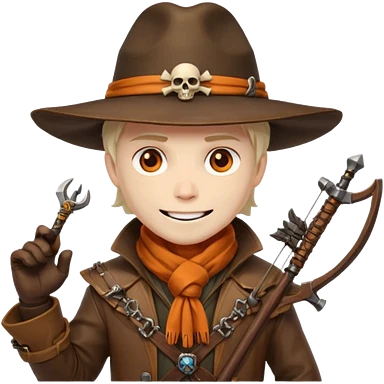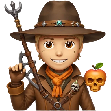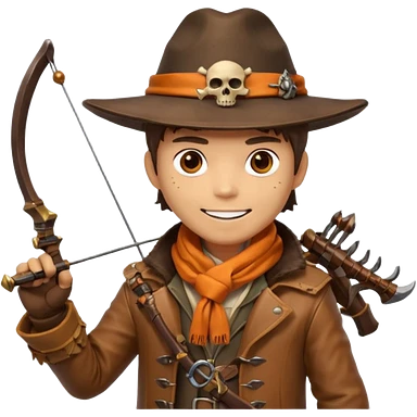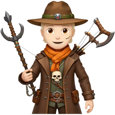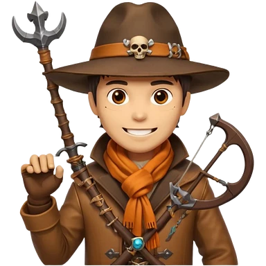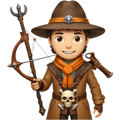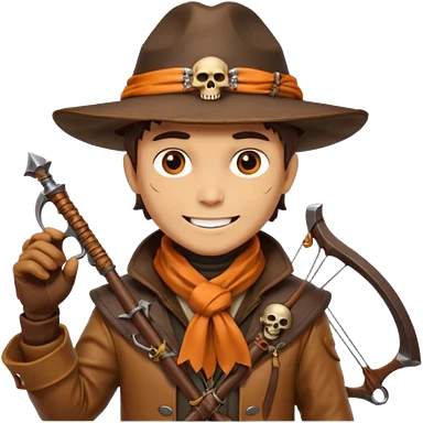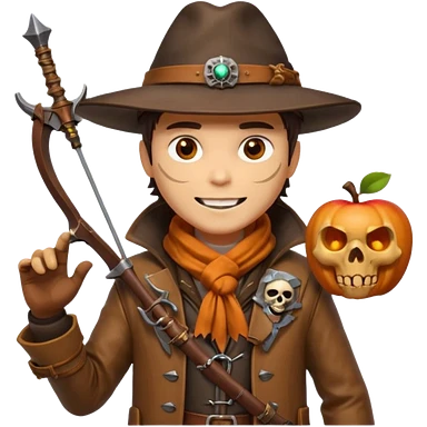 male human monster hunter emoji, wearing brown leather coat and wide hat, holding crossbow, with amulet shaped like skull, Halloween fantasy theme, confident smile, orange scarf, Apple emoji style, clean white background, square image emoji