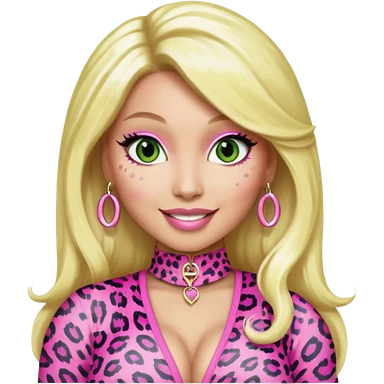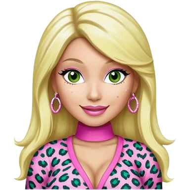 Smiling Green eyed light white skin Nicki Minaj wearing a pink leopard print outfit with blonde hair emoji