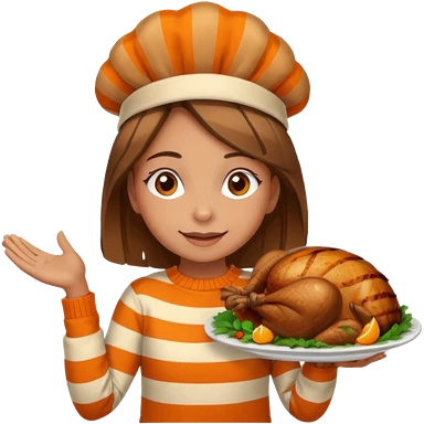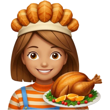 happy tan girl with an orange striped sweater and a cooked browned turkey on her head emoji