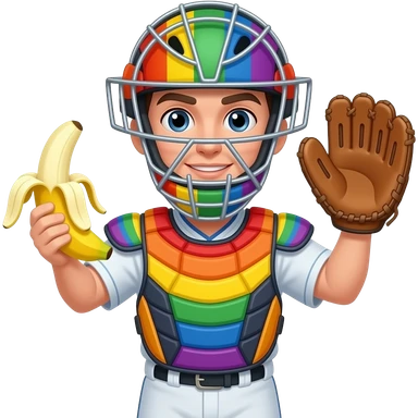 A baseball player. He is wearing rainbow colored catcher gear. He has a catcher mitt on his right hand and is holding a banana in his left had emoji