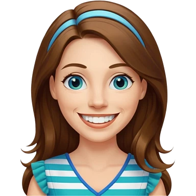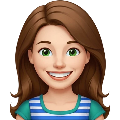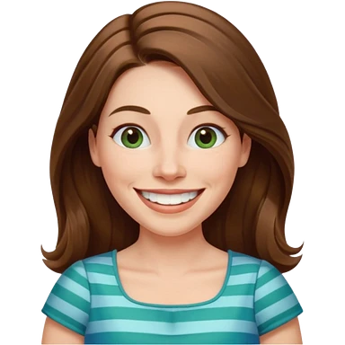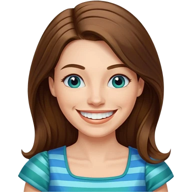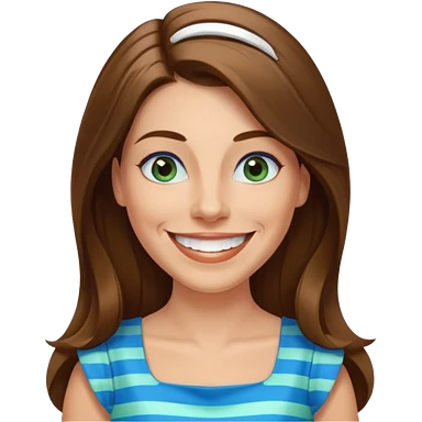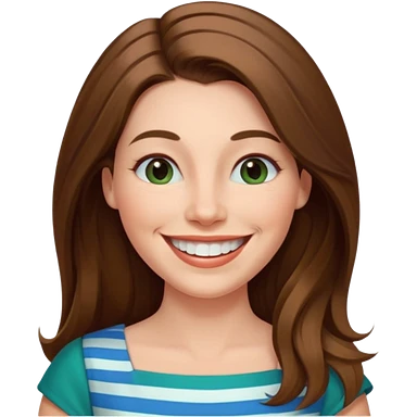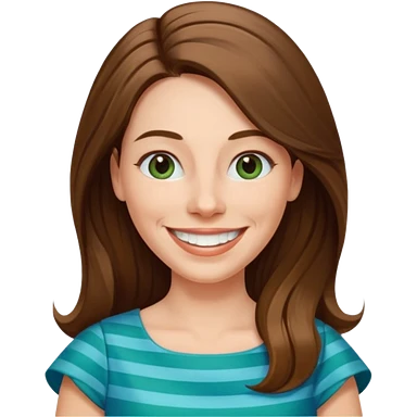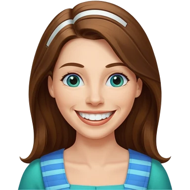 40 yr Caucasian woman, long brown hair parted on side, white stripe in hair, blue green dress ,big smile, white teeth, dimples, blue eyes emoji