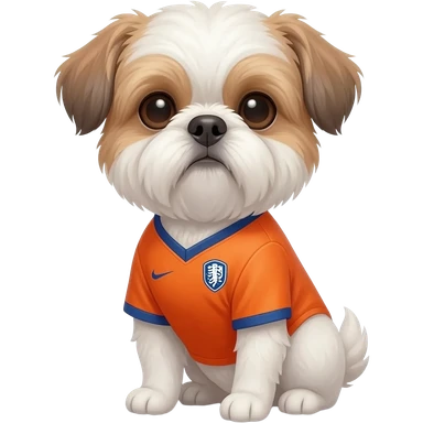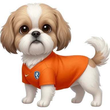 white and light brown shih zhu wearing a Netherland soccer jersey v neck 2026 work cup emoji