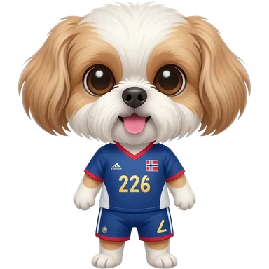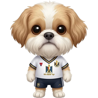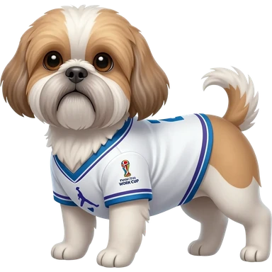 white and light brown shih zhu wearing a Japan soccer jersey v neck 2026 work cup emoji