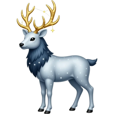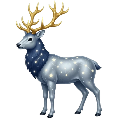 Celestial Stag emoji – full body, majestic stag with shimmering silver body and deep midnight-blue fur, tall glowing golden antlers shaped like constellations, small star accents, slight side angle emoji