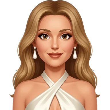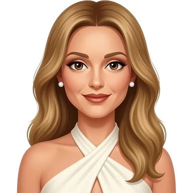 Celine Dion with brown eyes, long golden brown hair, ivory eyeshadow, bronze lipstick, ivory halter dress, white earrings emoji