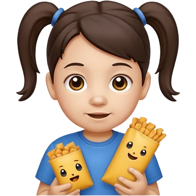 Toddler emoji with two pigtails dark brown hair, fair skin, holding snacks emoji