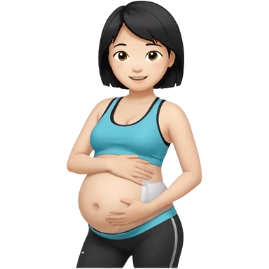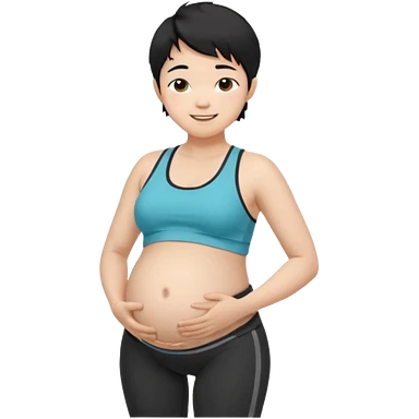 pregnant asian boy with short messy black hair wearing a sports bra with leggings holding his belly emoji
