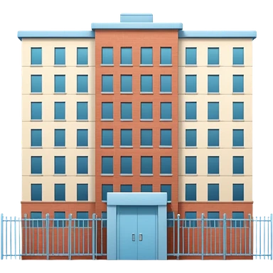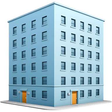 light blue rectangular 9-story apartment building surrounded by fence, closed courtyard, minimal flat vector icon, friendly clean design emoji