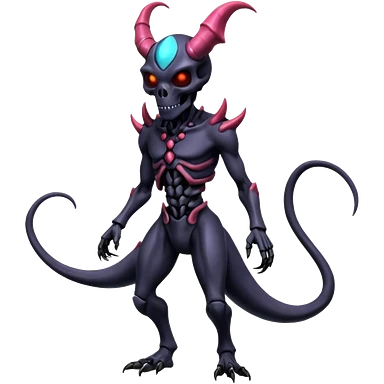 Shiny Horned Futuristic Badass Demonic Spectral Dusky Spooky Skull-faced Cool Hot Stylish Handsome Alien-Salandit-Darkrai-Genesect-Fakémon-fusion (full body) emoji
