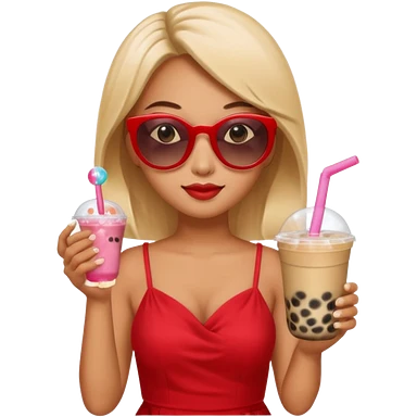 Female in red dress, holding bubble tea, wearing sunglasses emoji