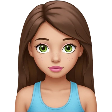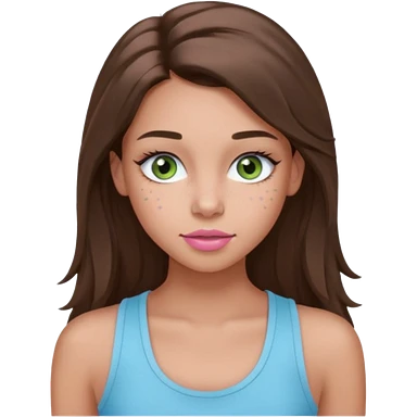Create a teen girl wearing a light blue tank top. She will have long brunette hair, tan skin, pink lips, and grey-green eyes. She has long eyelashes. She also has light freckles emoji
