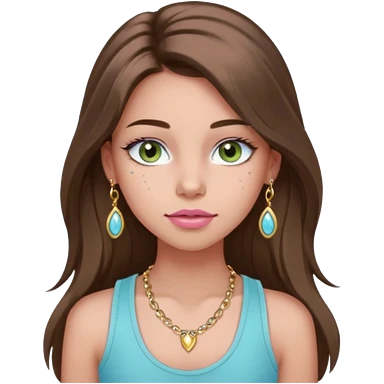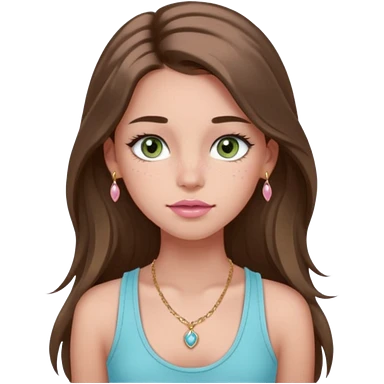 Create a teen girl wearing a light blue tank top. She will have long brunette hair, tan skin, pink lips, and grey-green eyes. She has long eyelashes. She also has light freckles and is wearing tiny gold jewelry emoji