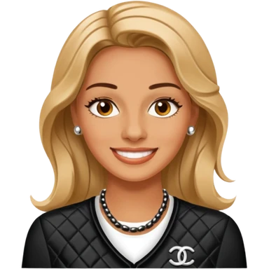 White girl with light brown long hair dressed up in black chanel suit with a chanel bag and red lipstick emoji