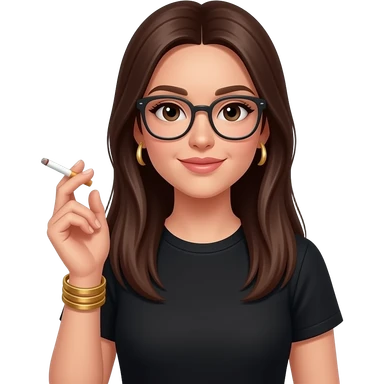 long dark brown straight hair, glasses, marketing, recruiting, gold bracelets and gold earrings, in black tshirt, holding cigarette emoji