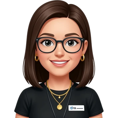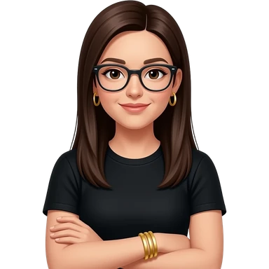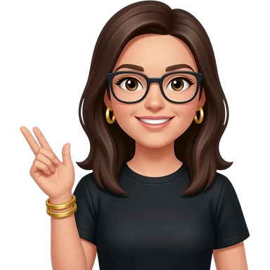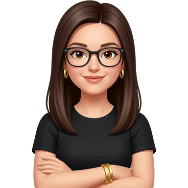 dark brown straight hair, glasses, marketing, recruiting, gold bracelets and gold earrings, in black tshirt emoji