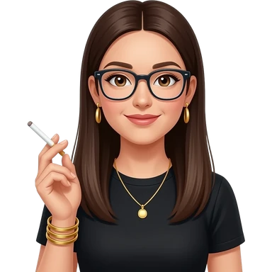 very long dark brown straight hair, glasses, marketing, recruiting, gold bracelets and gold earrings, in black tshirt, holding cigarette emoji
