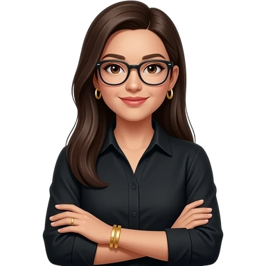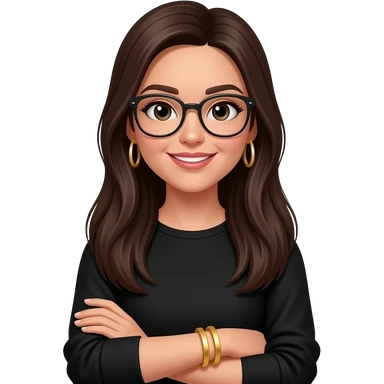 dark brown straight super long hair, glasses, marketing, recruiting, gold bracelets and gold earrings, in black long sleeve emoji