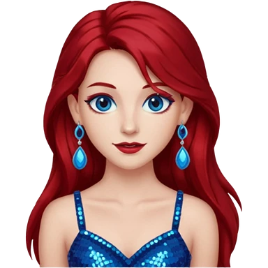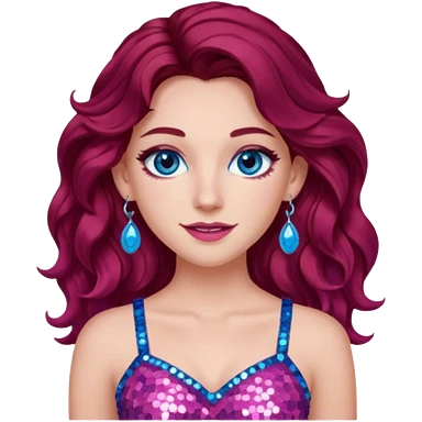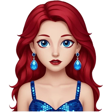 Chappell Roan (b.1998) with long dark red hair, red sequin crop top, red earring, blue eye, makeup emoji