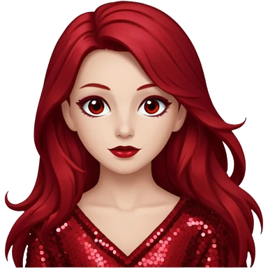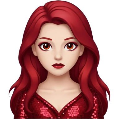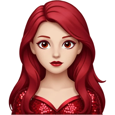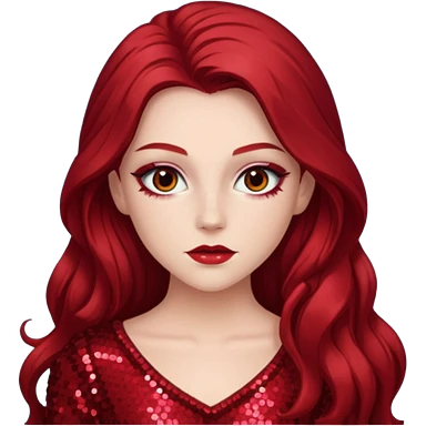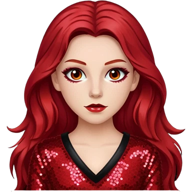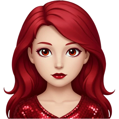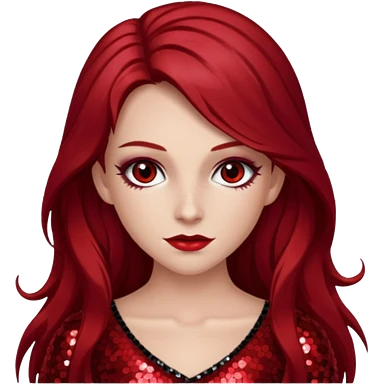 Chappell Roan (b.1998) with long dark red hair, red sequin outfit, makeup emoji
