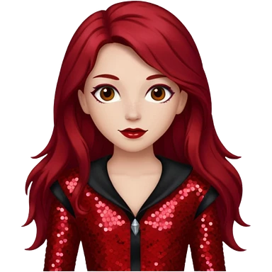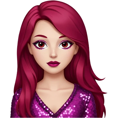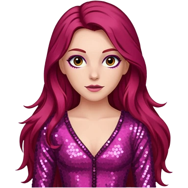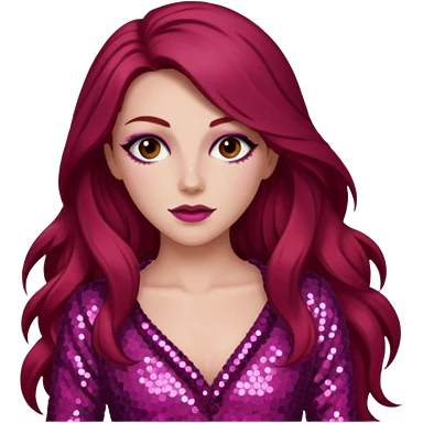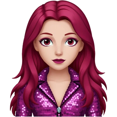 Chappell Roan (b.1998) with long dark red hair, dark pink sequin outfit, makeup emoji