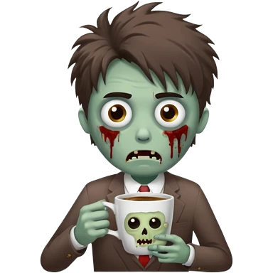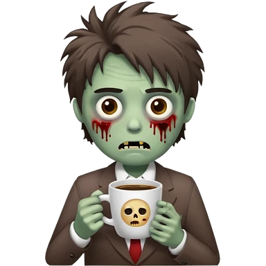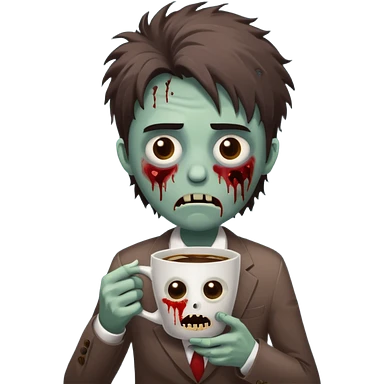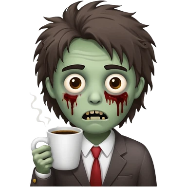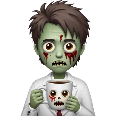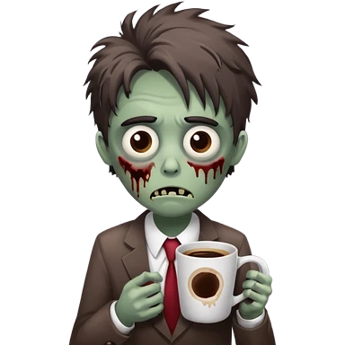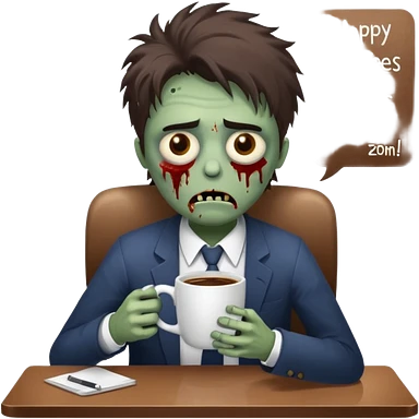 A cute but exhausted office worker character looking like a zombie, holding a giant cup of coffee, dark circles under eyes, messy hair, flat 2D vector art, white background, "Monday Vibes" text. emoji