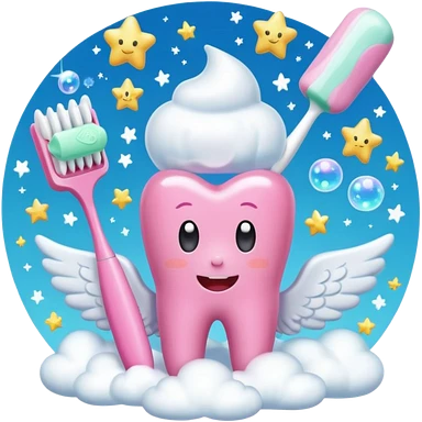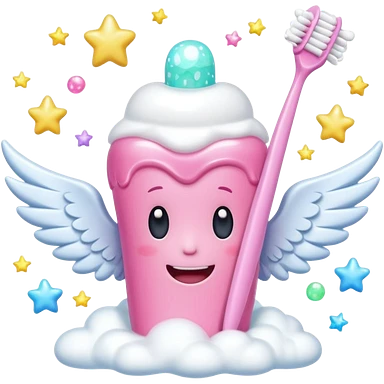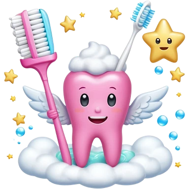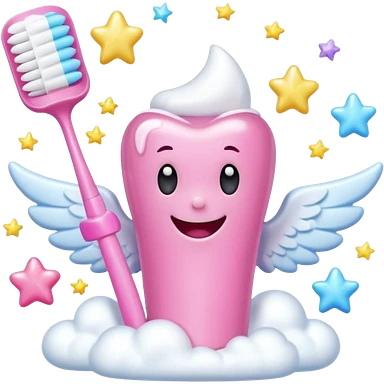 Giant cartoon toothbrush, pink toothbrush, cute molar character with angel wings, tube of pastel toothpaste, sparkles, magical sparkles, shooting stars, fluffy white clouds, soap bubbles, floating tooth fairy coins. emoji