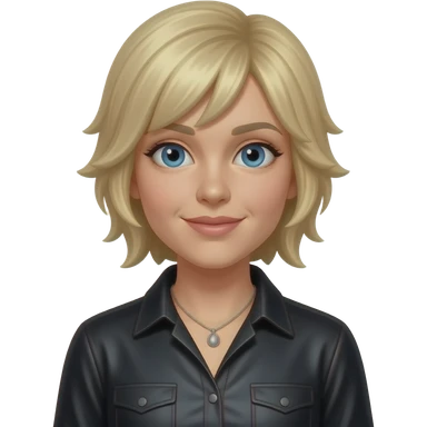 Ashley Parker Angel from O-Town with blue eyes, blonde shag hair, black metallic shirt, necklace emoji