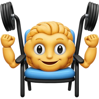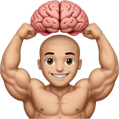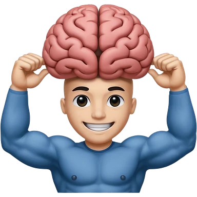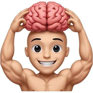 Un cerveau avec un immense sourire blanc, de beaux yeux noirs et de gros bras musclés qui sortent du cerveau emoji